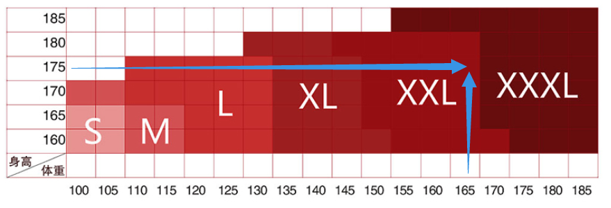 测量方法:参照下面不同色块区选择。如某员工身高175CM,体重165,那么如蓝色交叉线处色块为XXL,则夏季工作服选择XXL。个别员工无法找到尺码,请提供具体定制。