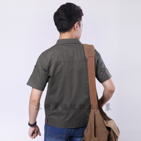 苏州鹰诺服装:深蓝配桔红短袖工作服AD069