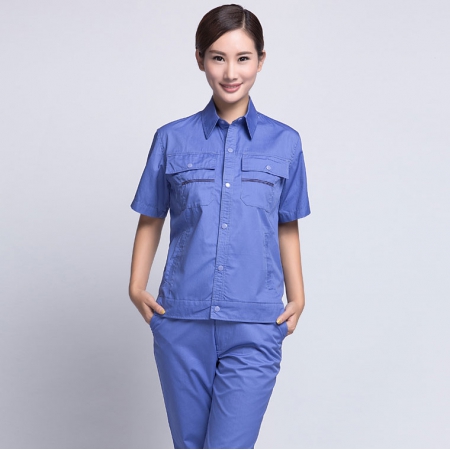 当前位置: 主页 > 苏州鹰诺服装:按工作服定制适合行业分类 > 机械加工工作服 > 湖兰色短袖工作服AD11-2